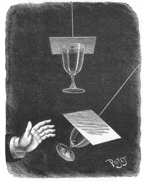 Nous savons que, si nous remplissons d’eau entièrement. un verre à bordeaux et que nous le couvrions d’une feuille de papier fort, de façon à éviter l’introduction de bulles d’air, le papier adhérera aux bords du verre, par suite de la pression atmosphérique, assez fortement pour que nous puissions brusquement retourner le verre sans voir Je liquide s’en échapper. Voici une application de ce principe : Attachez un fil au centre du carton qui recouvre le verre, en faisant traverser ce fil et en le retenant par un noeud; puis bouchez le trou au moyen d’une boulette de cire pour éviter toute rentrée d’air. Suspendez le verre, au moyen de ce fil, à un crochet fixé au plafond, et vous aurez ainsi un pendule, que vous pouvez faire osciller assez fort sans que le verre tombe. Non seulement on parvient à faire ainsi osciller un petit verre pendant une journée entière, mais encore on peut réussir l’expérience avec un grand verre contenant de l’eau et des gros sous. Les opérateurs feront bien de graisser le bord du verre avec du suif, pour augmenter son adhérence avec le carton. et surtout de n’exécuter au début l’expérience qu’avec un verre incassable.